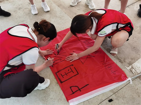 活動開始,教練講解了拓展訓練的相關知識,為接下來各小隊的“激戰”做足了準備。隨后一聲令下分組開始,各小組各展才華,紛紛出招,畫隊旗、想隊名,為自己團隊出謀劃策。